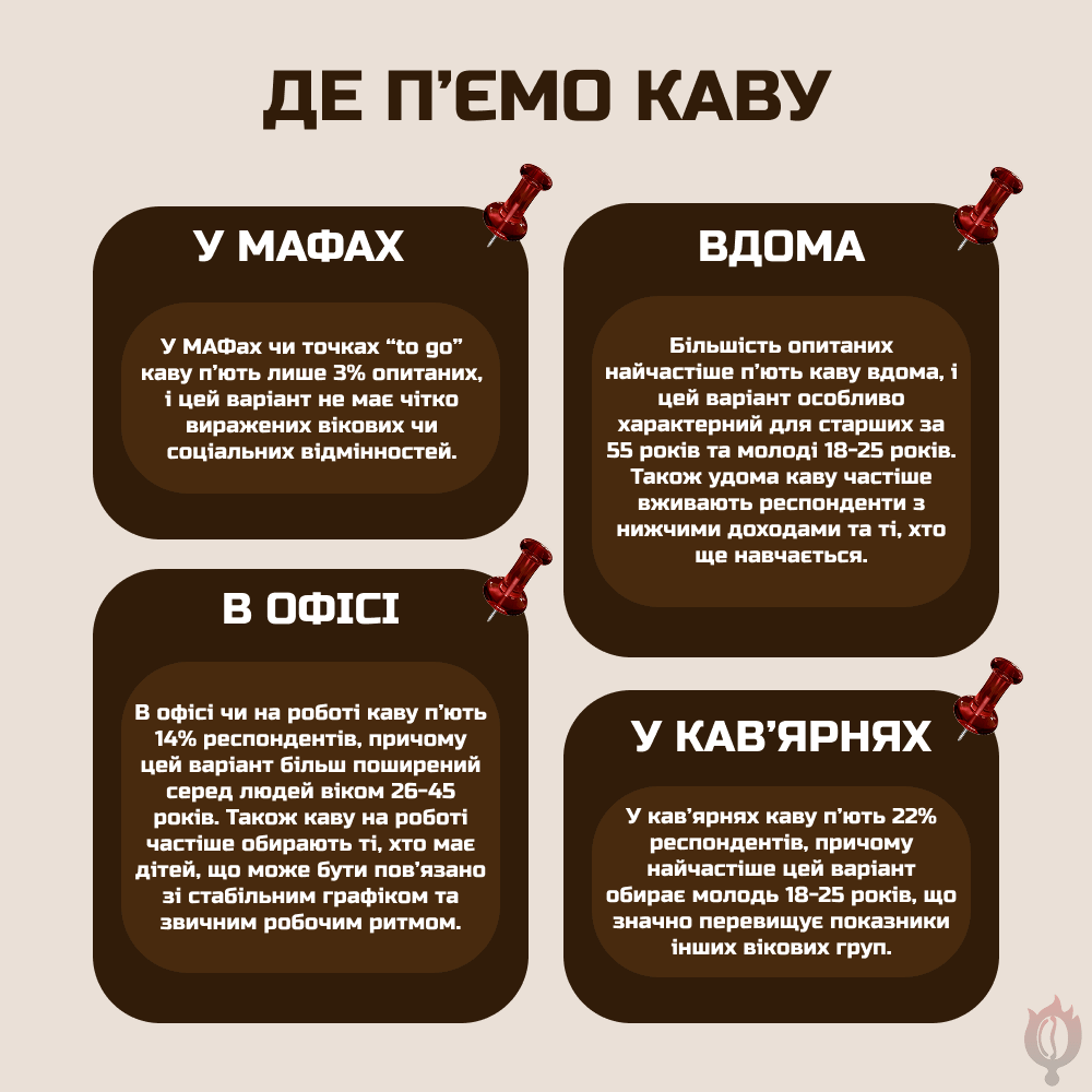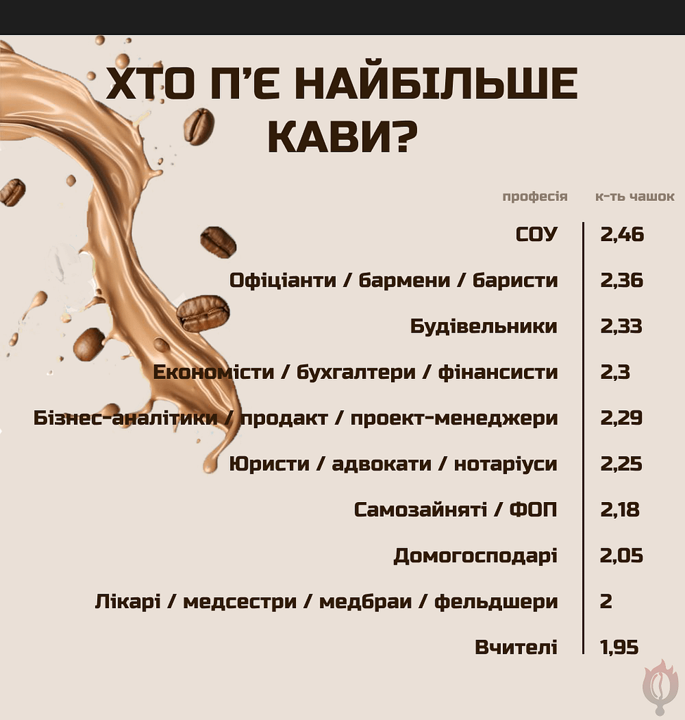 Тож, можемо підсумувати, що середньостатистична людина в Україні, яка найбільше споживає каву – це чоловік військовий, який п’є чорну заварну каву щодня з використанням кавомашини)