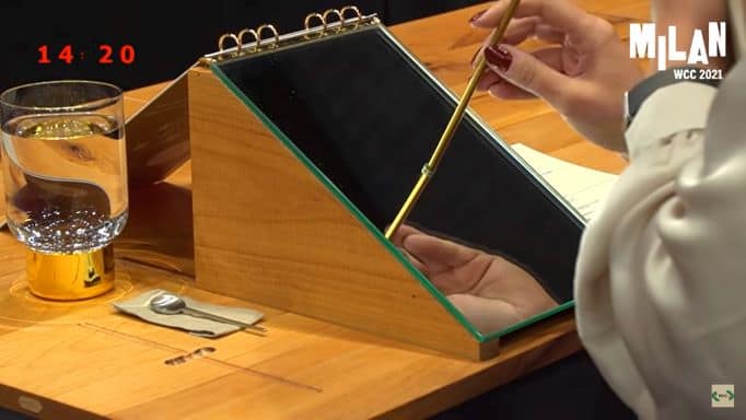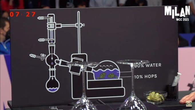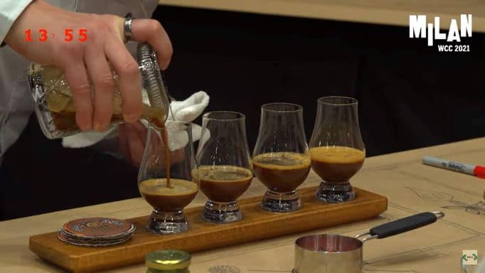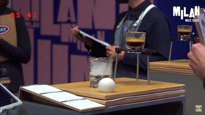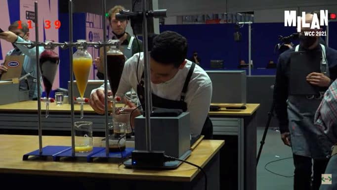 У приготуванні еспресо Г’ю додав у чашки холодний металевий камінь, щоб швидко охолодити напій і зберегти всі аромати, що зазвичай розпилюються за гарячої температури. Тож смак, обіцяний учасником, мав складатися з ароматів рожевої гуави, свіжого ананаса, маракуї та стевії.