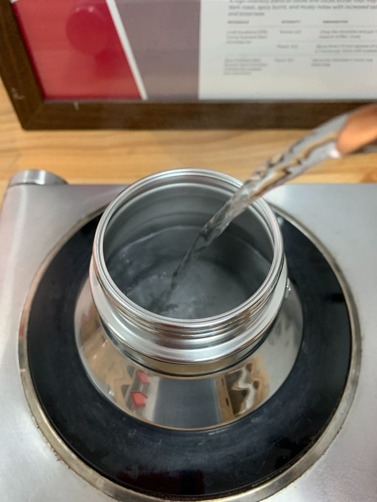 - Воду наливаємо в нижню колбу з розрахунку 100 мл води на 6-7 г меленої кави. Щоб прискорити процес, можна налити гарячу воду.