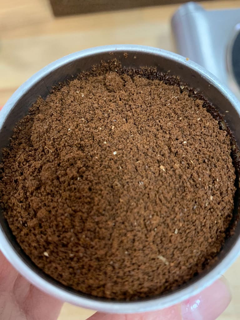 - У металевий фільтр насипаємо потрібну кількість кави. Всередині фільтру є бровка, що визначає кількість кави. Трохи притискаємо, щоб вирівняти таблетку.