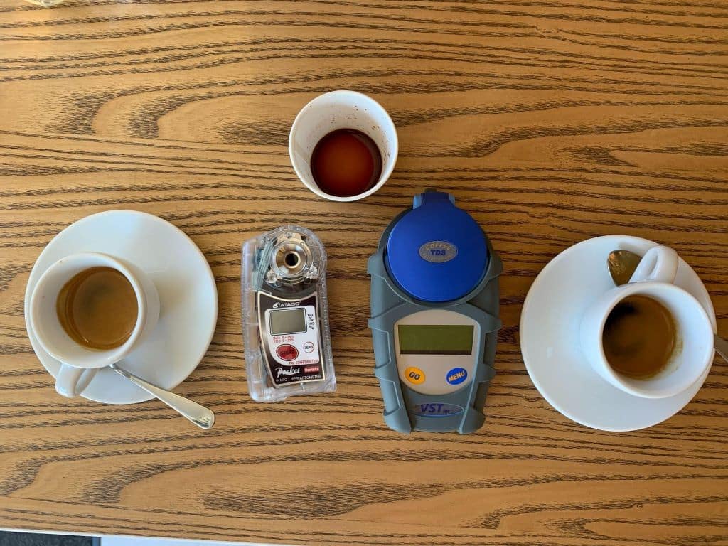 Ми провели невеличкий експеримент з рефрактометрами в одній з кав’ярень Києва. Ми хотіли порівняти показники двох найпопулярніших моделей – VST Coffee Tools (США) і Atago (Японія). У кав’ярні нам приготували фільтр-каву в Кемексі з ефіопських зерен натуральної обробки й два еспресо – з натуральної Бразилії та митої Руанди. Ефіопська та руандійська кава має високу щільність зерна, бо зростає вище 1600 м над рівнем моря. А бразильська має зерно низької щільності, бо висота зростання приблизно 900 м над рівнем моря.