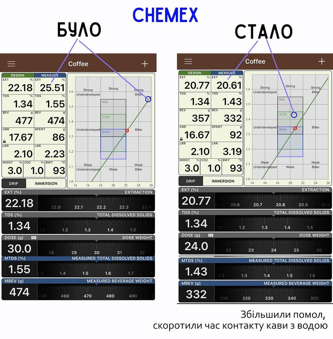 За першим рецептом кава вийшла переекстрагована (забагато гірких речовин). При максимально рекомендованому рівні екстракції 22% ми отримали 25,5% і дуже високу концентрацію. Час приготування склав 5,5 хвилин. Ми прийняли рішення скоротити час контакту з водою шляхом збільшення фракцій помолу і зменшили площу контакту води та фракцій.