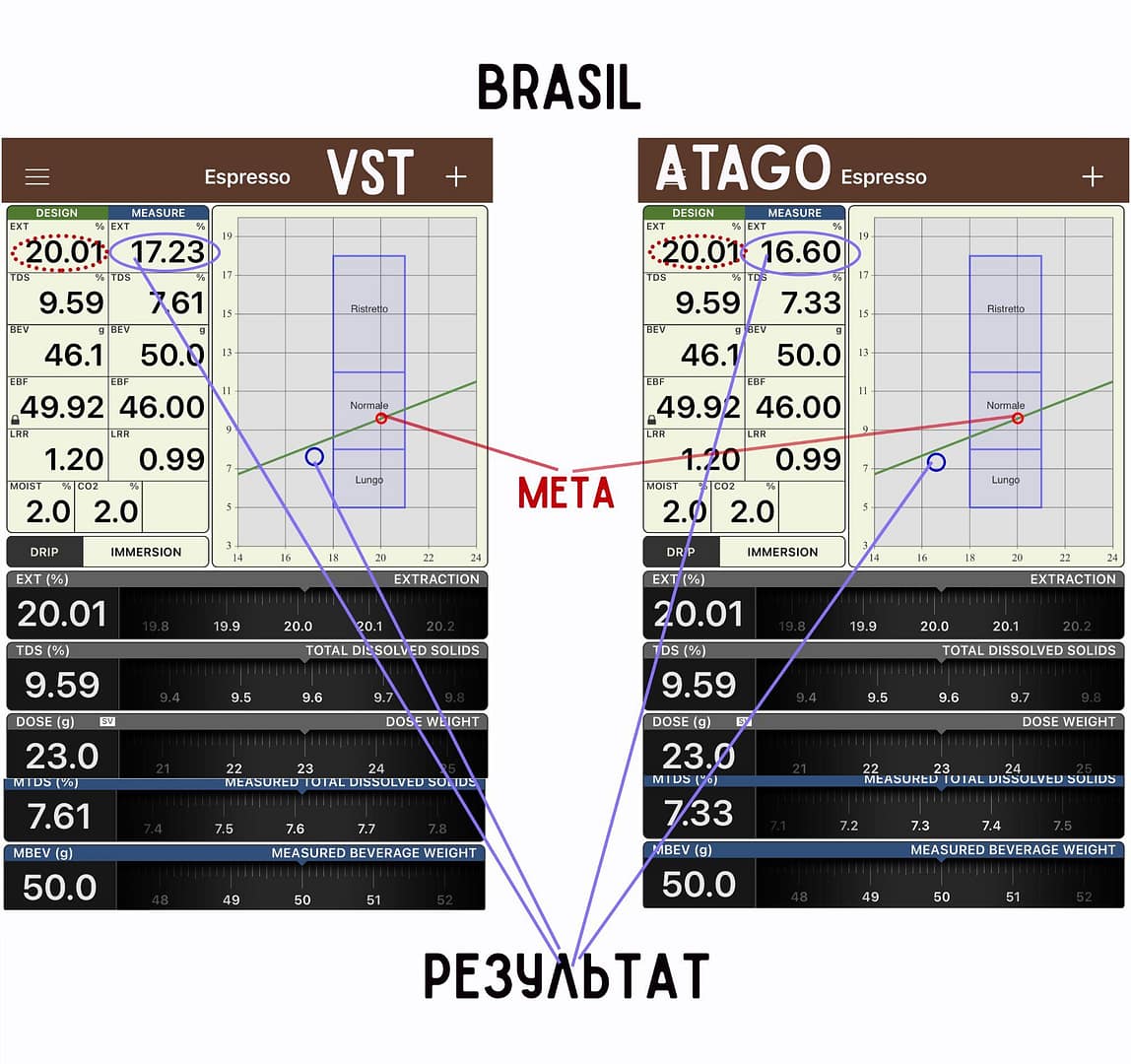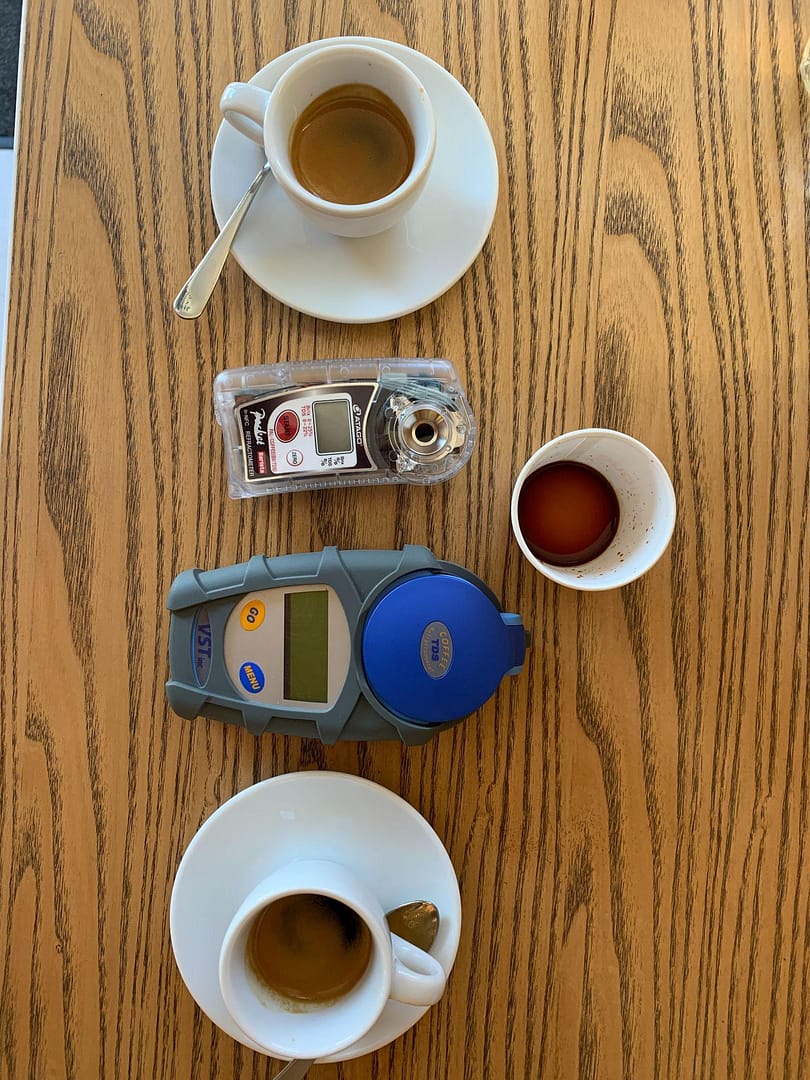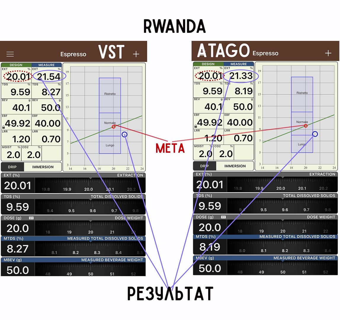 Для заварювання еспресо бариста використав 20 грамів кави на подвійному портафільтрі для Бразилії та 23 грами для Руанди. Ось що дали нам показники з різних рефрактометрів.