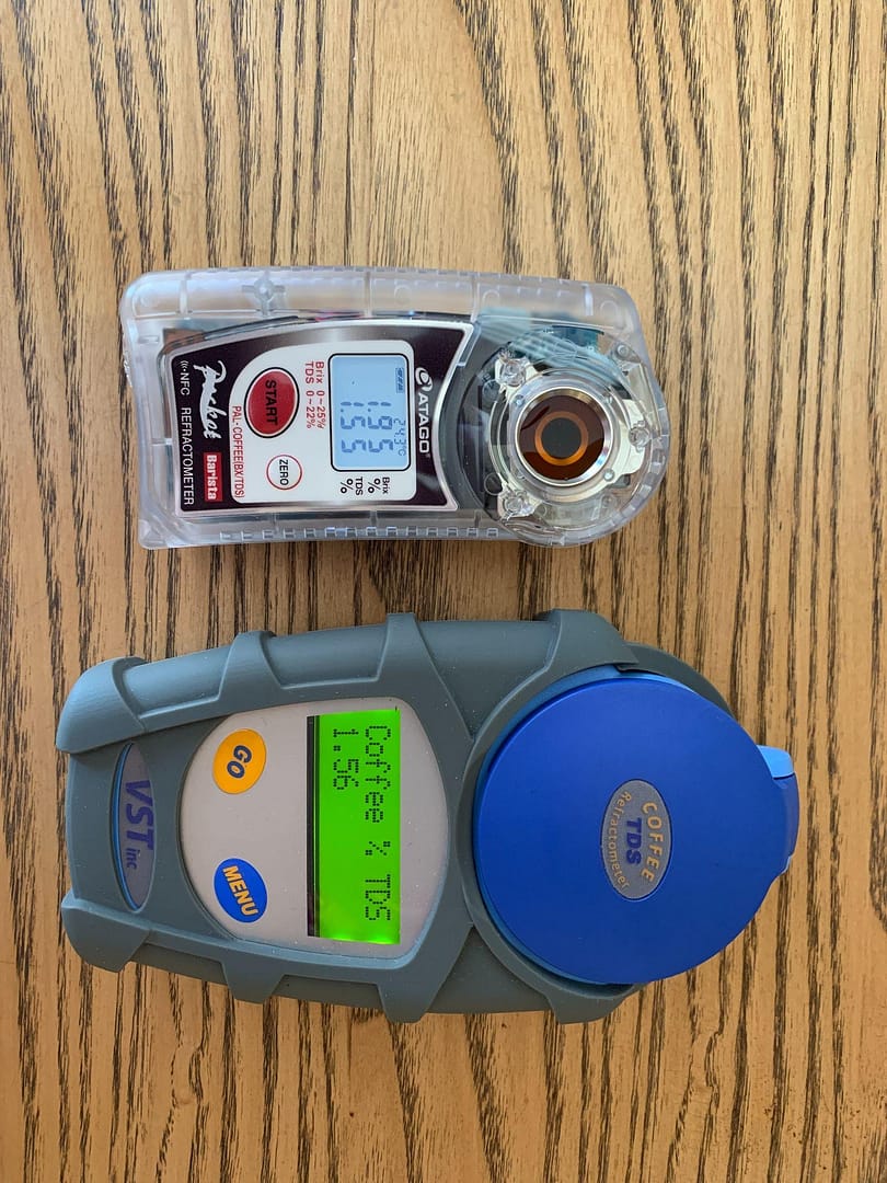 Кавовий рефрактометр VST – перший прилад для вимірювання саме кави, вважається більш точним і стабільним, ну а ми помітили, що він набагато швидше вимірює. Вартість такого в Україні – приблизно 1000 євро, але вони не завжди є в наявності.