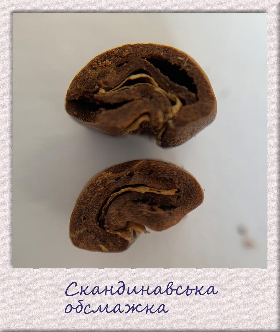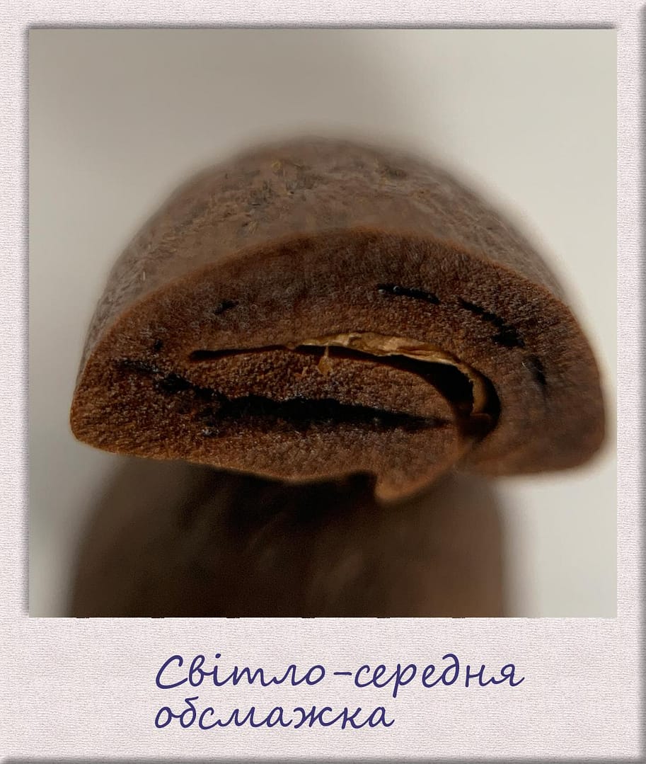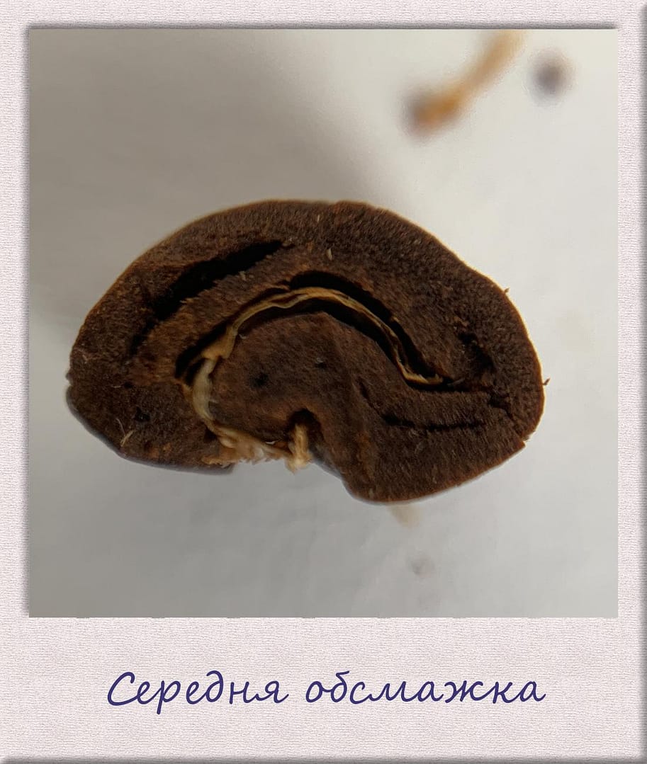 Вивантажуємо зерно на початку другого крека. Колір – глибокий шоколадний, поверхня зерна глянцева, з крапельками масел. У смаку – мінімальна кислотність, добре розвинена карамельно-шоколадна ароматика в смаку. Намічається легка гіркота горілого цукру. Ноти підсмажених горіхів, спецій, темного шоколаду, темної підсмаженої карамелі. Дану обсмажку краще використовувати для еспресо та напоїв з молоком. У фільтрі гіркота буде дуже помітна.