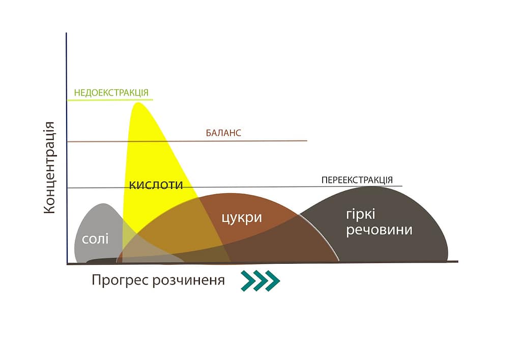 Недоекстрагованою є та кава, в якій розчинились кислоти та солі, але не встигли розчинитись цукри. Переекстрагованою є кава, в якій ми отримали забагато гірких речовин.
