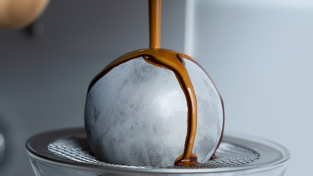 (На фото зображено як еспресо стікає на заморожену металеву кульку, а потім в чашку)