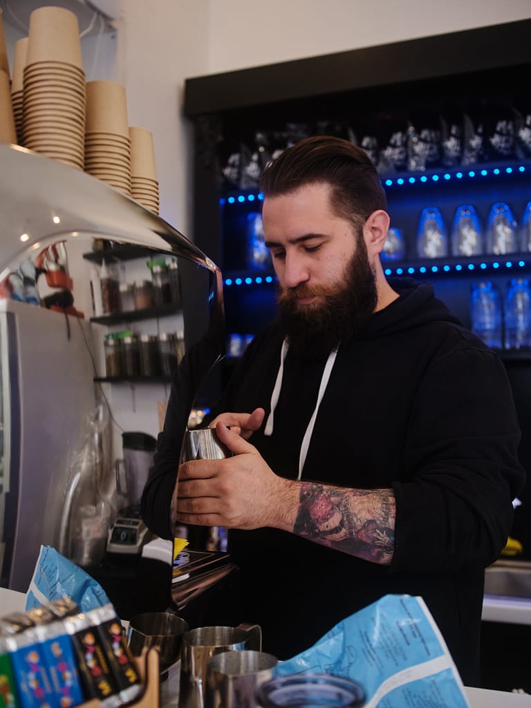 Макс (власник Крапки) з Харкова, через повномасштабне вторгнення переїхав в Київ минулого року і вирішив відкрити там невеличку кав’ярню. І вона справді невеличка! Всього двоє людей (тепер, правда, троє, бо один бариста не може працювати без вихідних).